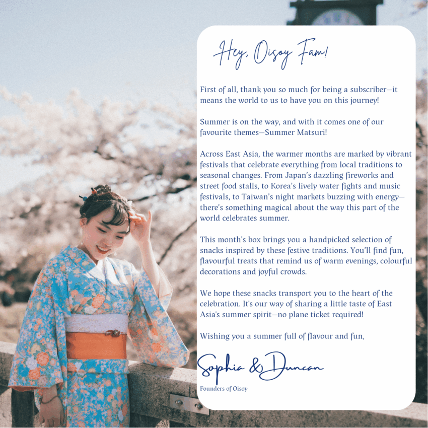 June’s box was a festival of flavours — literally! Inspired by Japan’s dazzling Summer Matsuri (祭り) celebrations, this month we packed your box full of treats that capture the colourful, fun-filled energy of summer festivals across East Asia. Fireworks, lanterns, street food stalls, yukata, and endless games — this box was our ode to warm nights and sweet memories. 🌙🍡