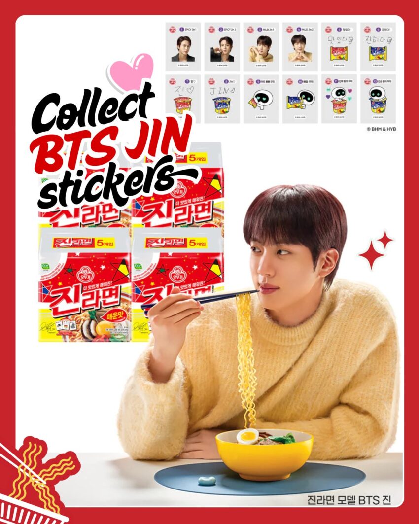 It’s hard to imagine a better marketing match than “Jin” (the singer) teaming up with “Jin Ramen”. The shared name has made fans chuckle: netizens quickly pointed out it’s an ideal pun (“Jin on Jin”). Ottogi themselves leaned into the humour, using slogans like “Jin’s love for Jin Ramen is the real deal” on social media (their Instagram even asked fans, “How do you show your Jinjja Love?” for Jin Ramen). In short, the campaign doesn’t take itself too seriously. It’s deliberately playful – the hero spot is more comedy rom-com than dry product ad, and the colourful new packs with stickers feel like a fun collectible.